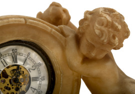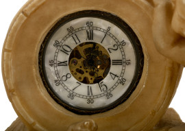 Orologio da taschino montato all'interno di un impianto in alabastro finemente scolpito, raffigurante due putti in pose giocose intenti a sorreggere la struttura che ospita il quadrante. Inizi del XX secolo, cm 17x14x8, (difetti).