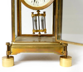 Orologio da tavolo a pendolo con cassa in ottone e vetro, decorazione smaltata. Francia, fine del XIX - inizi del XX secolo, cm 37x16,5x14,5. Meccanismo da revisionare.