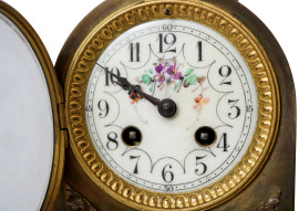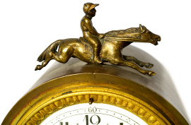 Quadrante smaltato con decorazioni floreali, numeri arabi e lancette in metallo cesellato. Scultura di fantino sulla sommità e scultura femminile automa in bronzo dorato all'interno della cassa