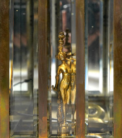 Orologio da tavolo a pendolo con movimento meccanico a carica manuale in ottone dorato, vetro e smalto. Olanda, fine del XIX secolo-inizi del XX secolo, cm 40x15x17, (difetti) Meccanismo da revisionare.