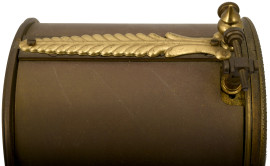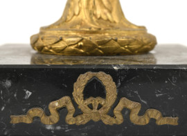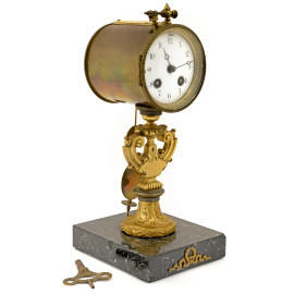 Il meccanismo è posizionato su un'elegante base in marmo con decorazioni in bronzo dorato a corona d'alloro e nastri. Il fusto è finemente lavorato a volute e foglie d'acanto. Completo di chiave di carica.