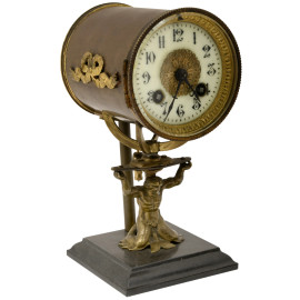 Orologio da tavolo con cassa cilindrica in bronzo patinato e dorato e base in marmo nero, tardo XIX secolo, (difetti). Meccanismo da revisionare. cm 21x12x10