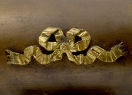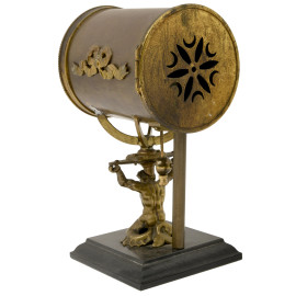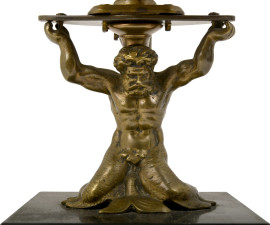 Quadrante smaltato con numeri arabi e lancette finemente lavorate. Il supporto presenta una scultura in bronzo dorato raffigurante tritone che sorregge l'orologio