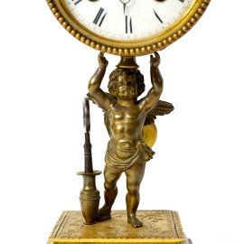 Movimento sorretto da putto in bronzo, poggiante su base quadrata dorata e piedistallo ebanizzato. Quadrante incorniciato da motivo a fascia perlinata sormontato da nudo di figura femminile disteso. Completa di chiavetta di carica.
