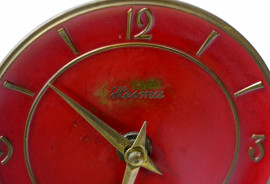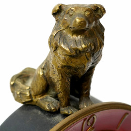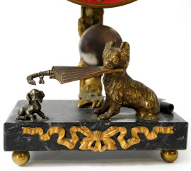 Il quadrante in smalto rosso con decorazione in rilievo dorata è sostenuto da una base in marmo nero arricchita da due piccole sculture di cani e applicazione a fiocco sul fronte. Scultura di cane alla sommità in bronzo dorato. Orologio completo di chiave di carica.