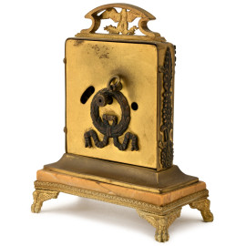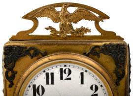 Orologio da tavolo in bronzo dorato con decorazioni floreali e un'aquila stilizzata nella parte superiore. Fine del XIX secolo, cm 13,5x10x5, (difetti, meccanismo da revisionare.)