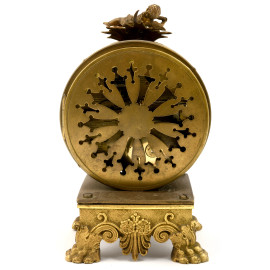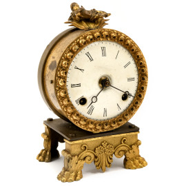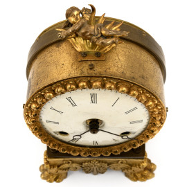 La parte superiore è adornata da un putto sdraiato su struttura raggiata. Quadrante a smalto bianco con numeri romani e lancette in metallo lavorato. L'orologio è montato su base quadrata in bronzo con quattro piedini fioriti, uniti al fronte da grambiale riccamente decorato con girali, meccanismo da revisionare.