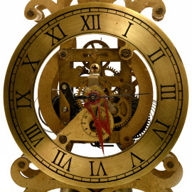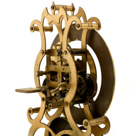 Meccanismo a vista e struttura in ottone con elementi traforati e quadrante con numerazione romana. Movimento meccanisco con sospensione a pendolo. Base in marmo nero.