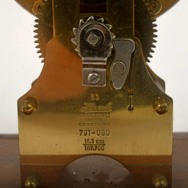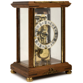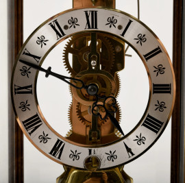 Orologio da tavolo scheletrato in teca di vetro e legno con inserti in bronzo dorato. Fine del XIX - inizi del XX secolo, cm 27,5x19x14. Meccanismo da revisionare, (difetti)