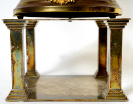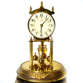 Meccanismo a bilanciere con 4 sfere, noto come orologio 400 giorni. Quadrante smaltato con decorazioni floreali, numeri arabi neri e lancette in metallo dorato.