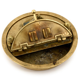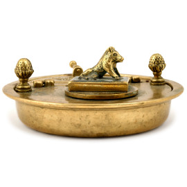 Particolare posacenere in bronzo dorato con la scritta a rilievo " Don't smoke too much" e rappresentazione stilizzata di due sigarette. Piccoli inserti a pigna e scultura di cinghiale al coperchio. XX secolo, diametro cm 15 (difetti).