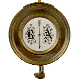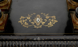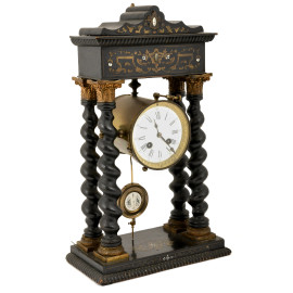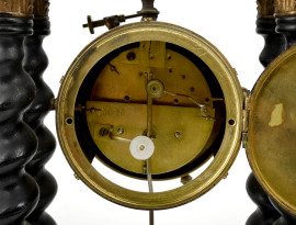 Struttura caratterizzata da cimasa sagomata e intarsiata con ornato di ispirazione classica e piccoli cammei ovali in madreperla. Quattro colonne tortili con capitelli in bronzo dorato incorniciano la cassa cilindrica. Base con decoro dorato e piccolo cammeo terminante con cornice ad intaglio unghiato. Quadrante a smalto bianco con numeri romani. Pendolo in bronzo dorato con centrale iscritto con le sigle R.A.