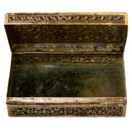 Piccola scatola portagioie in argento con coperchio cesellato in argento. XX secolo, cm 3x10x6; peso gr 148 (difetti)