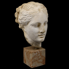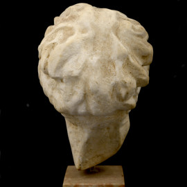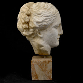 Piccola scultura di volto femminile in stile classico realizzato in gesso. Base quadrata in marmo. XX secolo, cm 23,5x13x11, (difetti)