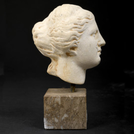 Piccola scultura di volto femminile in stile classico realizzato in pietra calcarea. Base quadrata in marmo. XX secolo, cm 11x3,5x3,5, (difetti)