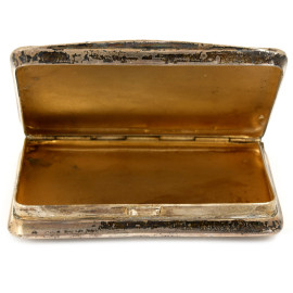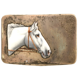 Piccola tabacchiera in argento 800/000 con decorazione a rilievo a smalto raffigurante cavallo bianco, XX secolo, cm 8x5x1; peso gr 83, (difetti e segni di ossidazione).
