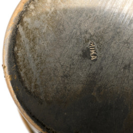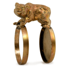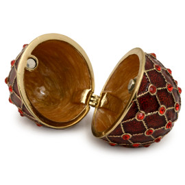Piccolo contenitore a guisa d'uovo impreziosito da dettagli in metallo dorato e pietre dure con supporto cilindrico e presa ad orso, XX secolo, cm 9x7x3, (difetti)