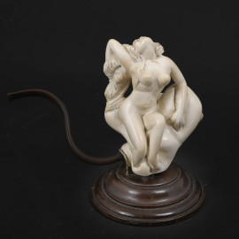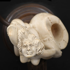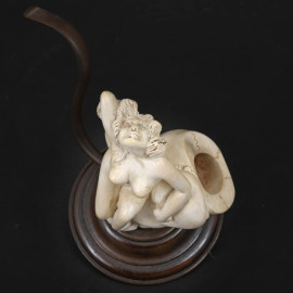 Pipa in spuma riccamente intagliata a guisa di figura femminile sdraiata. Base circolare in legno. XX secolo, cm 15x18x8, (difetti)