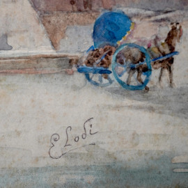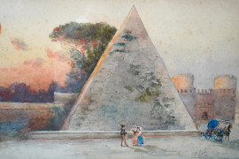 Piramide Cestia, acquarello su carta, XX secolo, cm 15,5x25,3 entro cornice. Firmato in basso a destra "E. Lodi"