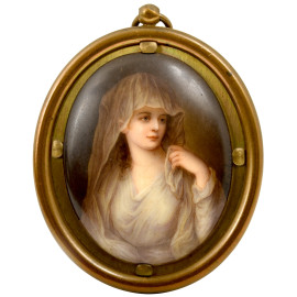 Pittore del XIX secolo, dipinto ovale su porcellana raffigurante donna con velo sul capo, cm 6,5x5, entro cornice, (difetti)