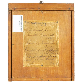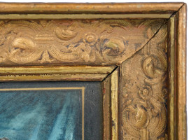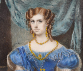 Pittore del XIX secolo, ritratto di nobildonna in ricche vesti turchesi, pastello su carta. Cm 16x10 entro passepartout e cornice, (difetti).