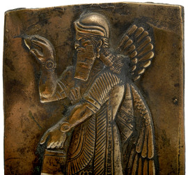 Placca decorativa in bronzo dorato con base in ottone, con rilievo raffigurante Hammurrabi. XX secolo, altezza cm 14, (difetti)