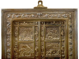 Placca decorativa MSD Tienam in bronzo dorato raffigurante la Porta del Paradiso del Battistero di Firenze . XX secolo, cm 12x9, (difetti)