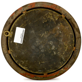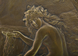 Placca in bronzo dorato a rilievo raffigurante figura femminile con corona di fiori davanti ad una cascata, inizi del XX secolo, diametro cm 24 entro cornice, (difetti)