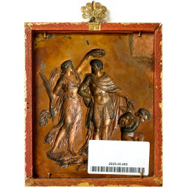 Placca in rame raffigurante scena di incoronazione allegorica, lamina di rame sbalzata, cm 13,5x11 entro cornice, XX secolo.