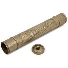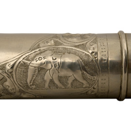 Portapergamene in metallo argentato con decorazione a sbalzo a girali e cammei con elefanti. India, XX secolo, cm 32x5x5, (difetti)