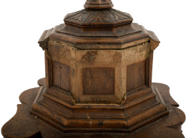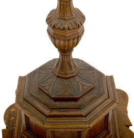 Portareliquie in legno intagliato, XX secolo. Presenta una parte superiore traforata con cornice riccamente decorata a volute e motivi floreali. Fusto tornito e scolpito. Base esagonale a più ordini di intaglio. (difetti, mancanze). Altezza cm 66