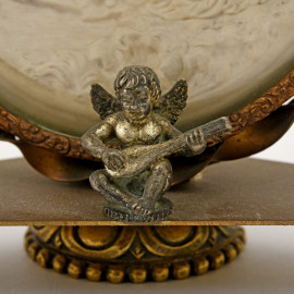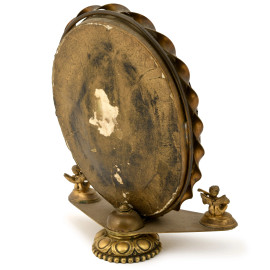 Rilievo in stucco raffigurante la Fuga in Egitto entro cornice in bronzo dorato con particolare lavorazione a nastro tortile lungo il profilo ovale. Supporto a mensola con 3 putti musicanti. Fine del XIX secolo, cm 19x15x7, (difetti)