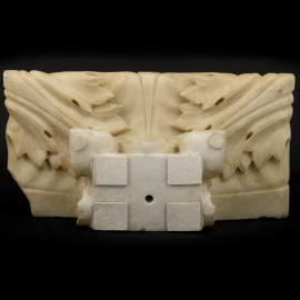 Riproduzione di mensola classica in marmo scolpito, XX secolo. Elemento decorativo ornato da motivi fogliacei stilizzati, tipici del repertorio classico e neoclassico, cm 10x37x19, (difetti)