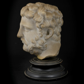 Riproduzione in marmo zuccherino di busto di imperatore romano, XX secolo. Base in legno, (difetti). Altezza con base cm 27; altezza senza base cm 21