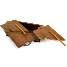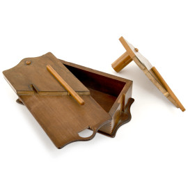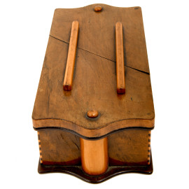 Scatola decorativa in radica di noce di forma mossa con filettature in varie essenze. Coperchio arricchito da due listelli in rilievo funzionali all'apertura e alla chiusura del coperchio. Inizi del XX secolo, cm 7x26x11, (difetti)