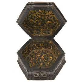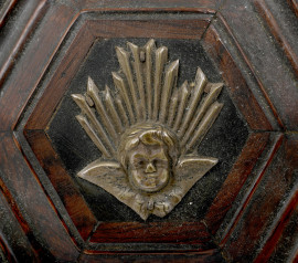 Scatola ottagonale in legno decorato a più ordini di intaglio concentrici. Applicazioni metalliche sul coperchio e al boccacchiave. Coperchio ornato con medaglione rafigurante un volto di putto con raggi stilizzati. XX secolo, cm 8,5x15x13, (difetti)