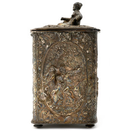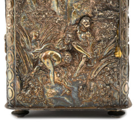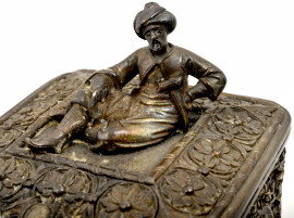 Scatola portagioie in metallo argentato finemente cesellato. Al coperchio presa con piccola scultura di ispirazione ottomana, XX secolo, cm 20x10x9, (difetti)