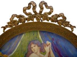 Scena di toletta a tecnica mista entro cornice in metallo ramato riccamente cesellata con motivi a girali e perlinature in tre ordini. XIX secolo, cm 16,5x16,5 entro cornice. (difetti)