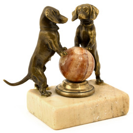 Scultura decorativa o fermacarte su base in resina con coppia di bassotti in bronzo dorato in piedi sulle zampe posteriori, intenti a toccare una sfera in pietra dura. XX secolo, cm 11,5x8x6, (difetti)