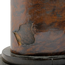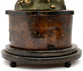 La scultura poggia su una base in legno impiallacciata in radica nella parte centrale. Al fronte si rileva applicazione in bronzo di cherubino e una targhetta. Mancanze all'impiallacciatura della base.