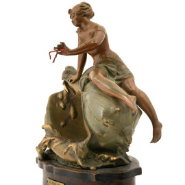 Scultura in antimonio patinato e dipinto raffigurante giovane donna seduta su una conchiglia stante a trattenere in mano un corallo rosso realizzato con trattamento del metallo a ceralacca. XX secolo, cm 30x18x12, (difetti)
