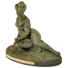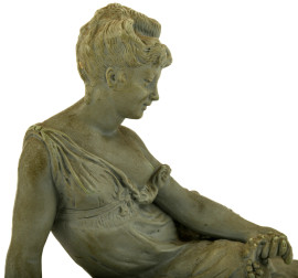 Scultura in biscuit dipinto nei toni del salvia raffigurante giovane donna distesa. Fine del XIX - inizi del XX secolo, cm 15x19x9, (difetti)