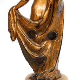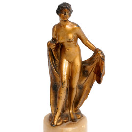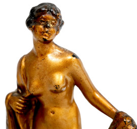 Scultura in bronzo dorato raffigurante una donna seminuda con drappo, montata su base in marmo, prima metà del XX secolo, altezza cm 16, (difetti)