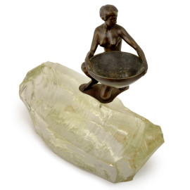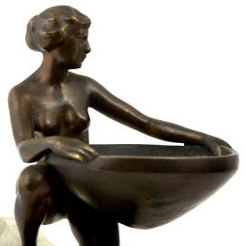 Scultura in bronzo patinato raffigurante giovane donna che sorregge un bacile, XX secolo, misura con base cm 21x22x10, (difetti)