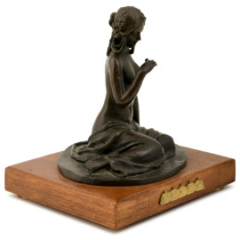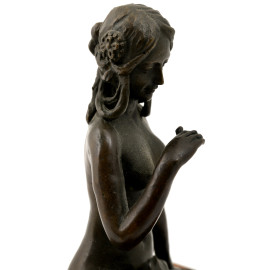 Scultura in bronzo patinato raffigurante una ninfa su base in legno con applicazioni in bronzo dorato. Inizi del XX secolo, cm 14x14x12, (difetti)