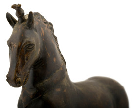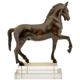 Scultura in bronzo raffigurante cavallo al trotto, XX secolo. Su base in plexiglass, cm 31x5x26x11, (difetti)