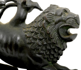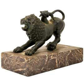 Scultura in bronzo raffigurante Chimera su base in marmo venato. XIX secolo, cm 16x20x10, (difetti e rotture alla base)