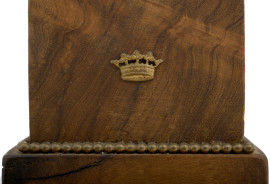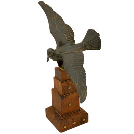Scultura in bronzo raffigurante colomba in volo su base a gradoni in legno. L'opera è realizzata con finitura brunita. Base composta da un piedistallo con borchie decorative. Inizi del XX secolo, cm 39x41x12, (difetti)