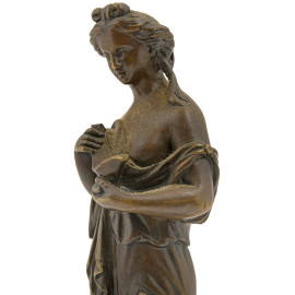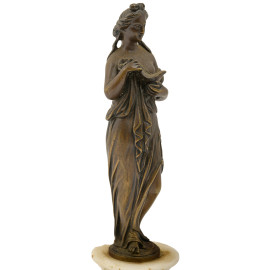 Scultura in bronzo raffigurante figura femminile panneggiata, su base in marmo bianco e supporto in pietra nei toni nel blu. XX secolo, cm 19x11,5x12, (difetti e mancanze)