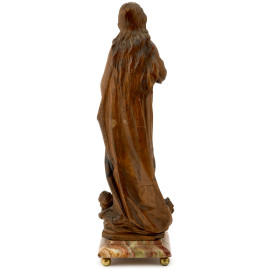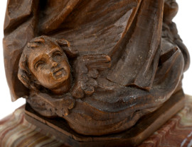 Scultura in legno raffigurante la Vergine sorretta da una coppia di putti. Base in marmo poggiante su quattro piedini sferici in bronzo dorato, cm 38x10x01, XX secolo,(difetti)